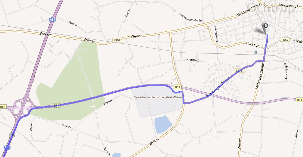 » Auf der A31 fahrend die Abfahrt (B54 Gronau/Ochtrup) in Richtung Ochtrup abfahren.